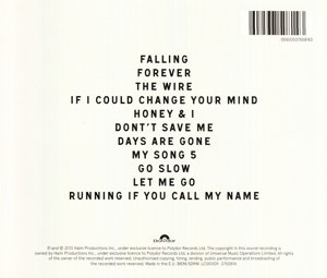 HAIM - Days Are Gone: This CD cover shows the band sitting on chairs on a patch of grass doing the same pose. This makes them look very sophisticated as they are also wearing sunglasses and the fact they're doing the same pose makes them look almost like models posing. This connotes that they are a stylish and sophisticated band who appeal to the stylish kind of person. The font is simple and the letters are capitalised and in white to stand out against the green grass. Its in the corner of the cover along with the title of the CD as they want the picture on the front to be focused on more and stand out more than the title.